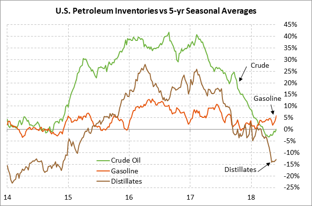 Looking ahead, the market over the next 1-1/2 years is expecting +98 bp of Fed rate hikes (including today’s expected +25 bp rate hike) from the current mid-point funds rate target of 1.63%. That is down by 12 bp from the peak of +110 bp seen in mid-May. Market expectations for Fed rate hikes through 2019 have eased a bit in recent weeks mainly because of (1) the Italian political crisis that caused worries about the Eurozone economy, and (2) the recent decline in oil prices that has helped cool inflation expectations a bit. The 10-year breakeven inflation expectations rate is currently at 2.14%, which is 7 bp below the mid-May 3-3/4 year high of 2.21%.
