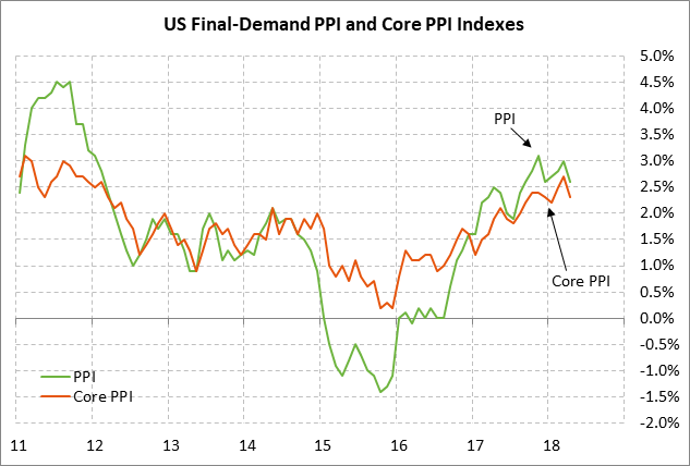 U.S. PPI expected to contribute to the stronger May inflation picture — The market consensus is for today’s May final-demand PPI report to rise to +2.8% y/y from April’s +2.6%, while the May core PPI is expected to be unchanged from April’s +2.3%. Today’s expected report of +2.8% would leave the headline PPI just 0.3 points below the 6-1/4 year high of +3.1% posted in Nov 2017. Today’s expected April core PPI report of +2.3% would leave the series just 0.4 points below March’s 6-year high of +2.7%.