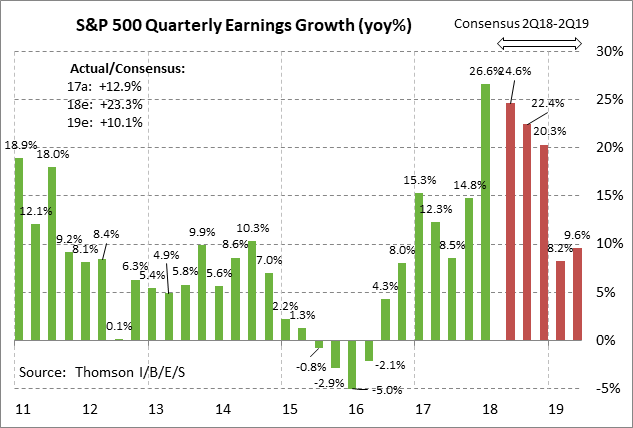 S&P 500 earnings growth in Q2 was very strong at +24.6%, just below Q1’s +26.6% pace.   Looking ahead, earnings growth is expected to remain above 20% in the second half of this year at +22.4% in Q3 and +20.3% in Q4, according to Thomson I/B/E/S.  On a calendar year basis, the consensus is for very strong SPX earnings growth this year of +23.3%.  Earnings growth is then expected to decelerate to +10.1% in 2019 as the effects from the Jan 1 tax cut start to wear off.