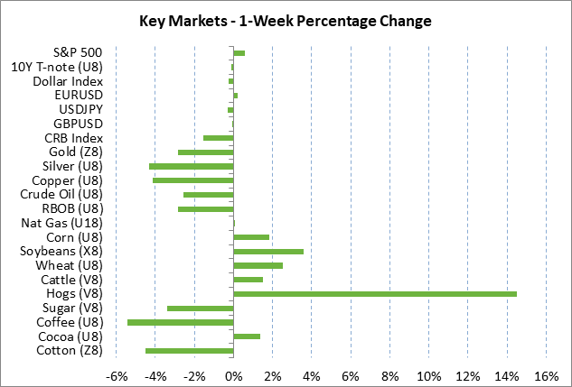 Weekly market focus — The U.S. markets this week will focus on (1) whether mid-level US/Chinese trade negotiations on Wednesday and Thursday produce any progress, (2) whether President Trump this week levies any new sanctions on Turkish President Erdogan’s government for still refusing to release American pastor Brunson, (3) this week’s Fed Jackson Hole conference and Fed Chair Powell’s speech on Friday, (4) the Treasury’s sale of 5-year TIPS on Thursday, (5) the wind-down of Q3 earnings season with only 18 of the S&P 500 companies scheduled to report, and (6) a light economic calendar with the main events including Wednesday’s FOMC minutes, housing reports on Wednesday and Thursday, and July durable goods orders on Friday.