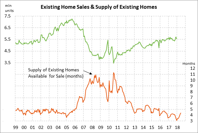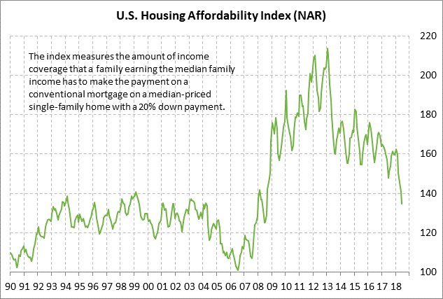 US existing home sales expected to stabilize after 3-month decline — The market consensus is for today’s July existing home sales report to show a small +0.4% increase to 5.40 million, stabilizing after the 3-month decline totaling -4.0% to June’s 9-month low of 5.38 million. Existing home sales have now fallen by a total of -5.9% from last November’s 11-year high of 5.72 million units. U.S. home sales have recently fallen due to the limited supply of homes available for sales and due to resistance by some buyers to high home prices. In addition, the current 30-year mortgage rate of 4.53% is up by +60 bp since late-2017, thus making homes much less affordable. Indeed, the NAR Housing Affordability index in June fell to a 10-year low of 134.8, illustrating that homes are the least affordable in a decade.