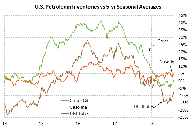 Weekly EIA report — The market consensus for today’s weekly EIA report is for a -2.0 mln bbl drop in U.S. crude oil inventories, a -1.0 mln bbl drop in gasoline inventories, and a +1.5 mln bbl rise in distillate inventories. Crude oil inventories are currently +0.6% above the 5-year seasonal average, gasoline inventories are +4.3% above average, and distillate inventories are -7.6% below average. Last week’s U.S. crude oil production level of 10.9 mln bpd was just slightly below July’s record high of 11.0 mln bpd.