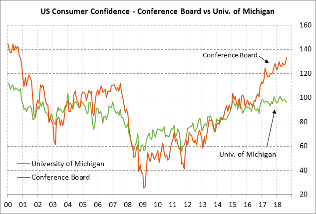However, the weakness in the University of Michigan’s consumer sentiment index needs to be taken with a grain of salt because the Conference Board’s U.S. consumer confidence index, by contrast, has shown surprising strength in recent months. In fact, the Conference Board’s index in August rose sharply by +5.5 points to a new 17-3/4 year high of 133.4.