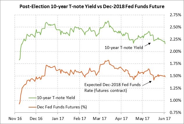 U.S. unemployment report has only minor consequences for Fed policy — Last Friday’s May payroll report of +138,000 was substantially weaker than the consensus of +180,000. There were also downward revisions totaling -66,000 for March (to +50,000 from +79,000) and April (to +174,000 from +211,000). The 3-month payroll average is now only +121,000. The May unemployment rate fell to a new 16-year low of 4.3% but that decline was due mainly to a shrinkage of the workforce rather than a surge in jobs.