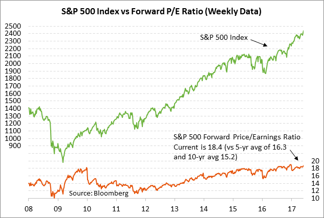 The U.S. stock market has rallied sharply in the past two weeks on continued support from strong 2017-18 earnings expectations along with a cooler outlook for U.S. interest rates. The market is also still holding out some hopes for at least a modest-sized tax cut and some infrastructure spending. However, the 2-week rally has also pushed the S&P 500 forward P/E ratio up to 18.76, which is well above the 5-year average of 16.3 and the 10-year average of 15.2.