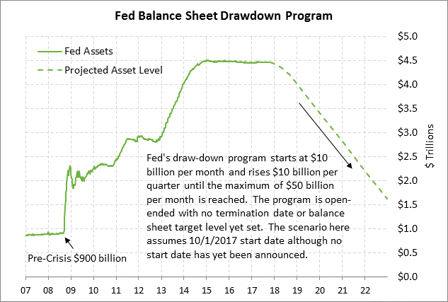 The roll-off program’s initial cap of $10 billion per month ($6 billion of Treasuries and $4 billion of mortgage securities) was right in line with the median of a recent Bloomberg survey. The cap will then rise by $10 billion per quarter until it reaches the maximum cap of $50 billion per month. If the Fed starts the program on Oct 1, then the Fed’s balance sheet would fall by $30 billion in 2017, $420 billion in 2018, and $600 billion per year in 2019 and beyond.