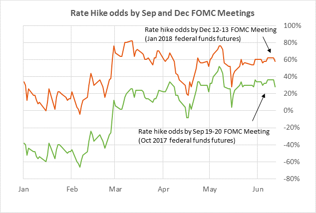 The federal funds futures curve on Wednesday turned more dovish by 2 bp for the late-2017 contracts, 2-4 bp for the 2018 contracts, and 4-6 bp for the 2019 contracts. The odds on Wednesday for a September rate hike fell to 28% from 36% and the odds for a December rate hike fell to 58% from 62%. The outlook for Fed policy turned more dovish because of (1) Wednesday’s weak May retail sales report of -0.3% and May CPI report of +1.9% y/y and +1.7% core (vs April’s +2.2% and +1.9%, respectively), and (2) the Fed’s announcement of the details of its balance sheet roll-off program, which could mean the Fed is putting a higher priority on starting its roll-off program this year than on raising rates another notch.