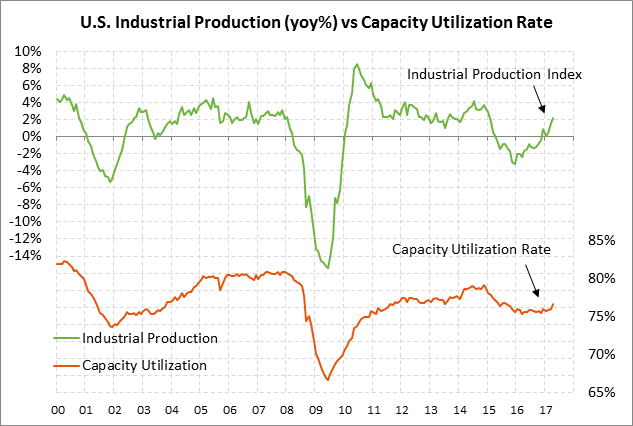 U.S. industrial production has risen for three straight months (Feb-April) as production and shipments catch up with the post-election surge in orders seen during Dec-March. The improvement in industrial production also stems from stronger global economic growth and the weaker dollar seen so far this year. Questions remain for the U.S. manufacturing sector, however, since manufacturing confidence has slipped in the past several months. The ISM manufacturing index in the past three months (Mar-May) has fallen by a net -2.8 points to 54.9 while the ISM manufacturing new orders sub-index has fallen by a net -5.6 points to 59.5. Still, those are relatively strong confidence levels that suggest that the U.S. manufacturing sector should continue to grow at a solid pace in coming months.
