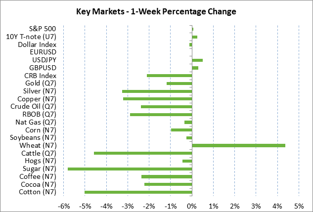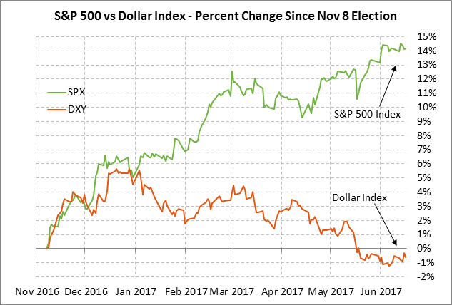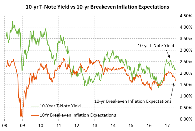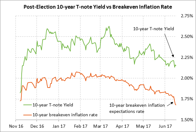 Last week’s more dovish view of Fed policy was driven by soft inflation and economic data. The May CPI last week fell to +1.9% y/y and the core CPI fell to +1.7% y/y. Meanwhile, the 10-year breakeven inflation expectations rate last Friday fell to a 7-month low of 1.68% where it was well below the Fed’s inflation target of +2.0% and was even -5 bp below the pre-election level of 1.73%. Inflation expectations fell due to (1) the decline in the CPI report, (2) continued weakness in crude oil and commodity prices in general, (3) softer U.S. economic data, and (4) reduced expectations for the Republican growth agenda.