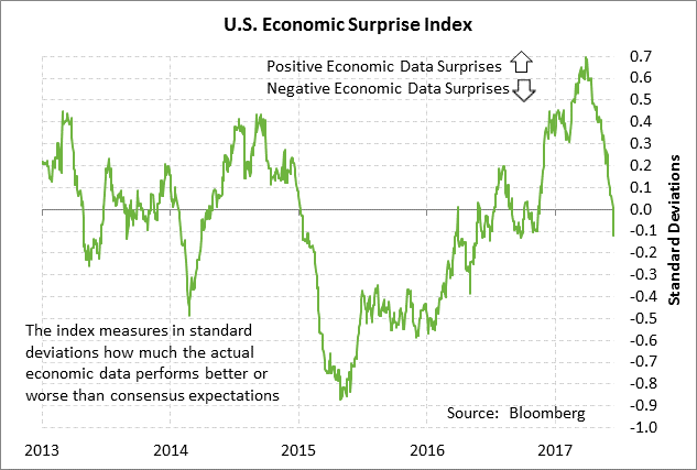 The recent weakness in the U.S. economic data has caused the Bloomberg U.S. Economic Surprise index to plunge over the past 2-1/2 months. That index fell into negative territory last week for the first time since last November. The plunge in the index shows how the recent U.S. economic data has been substantially weaker than market expectations.