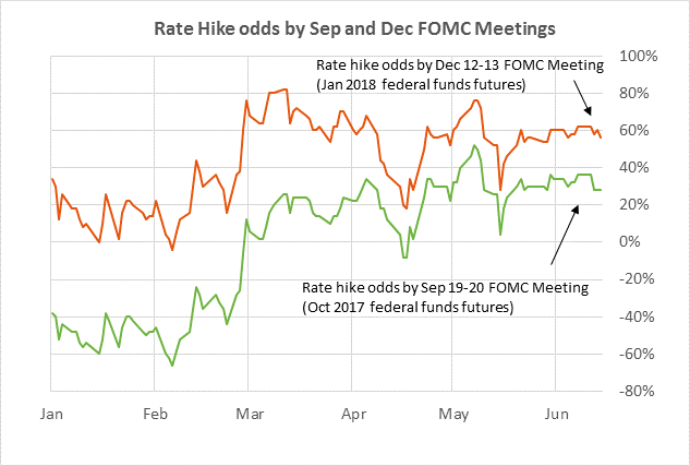 Fed policy expectations turn more dovish — The FOMC last week raised rates by another +25 bp but market expectations for the Fed’s future policy nevertheless turned more dovish. The federal funds futures curve last week turned more dovish by 2 bp for the late 2017 contracts, 2-4 bp for the 2018 contracts, and 4-5 bp for the 2019 contracts. The market last week reduced the odds for a rate hike later this year to 28% (from 36%) by September and to 56% (from 62%) by December.