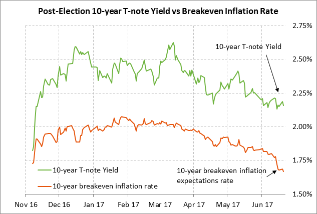 The market consensus is that U.S. Q2 GDP will rebound to +3.0% after showing weak growth in Q1 of +1.2%. The market is then expecting GDP growth to settle in around +2.4% in the second half of 2017. The recent U.S. economic data has been disappointing as seen by the fact that the Bloomberg U.S. Economic Surprise index has plunged in the past 2-1/2 months to a 9-month low. However, the Fed remains confident that the U.S. economy will regain its momentum due to generally strong U.S. consumer and business confidence, rising consumer income, and improved global growth.