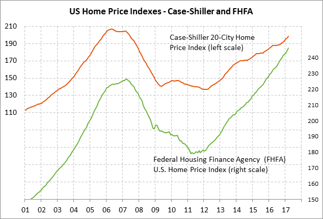 FHFA U.S. home prices expected to show continued strength — The consensus is for today’s FHFA Apr house price index to show another strong increase of +0.5% m/m, adding to the strong increases of +0.8% in February and +0.6% in March. The FHFA index in March was up sharply by +6.2% y/y and was up by a total of +37% from the housing-bust low seen in March 2011.