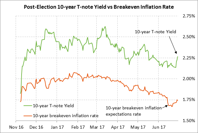 Fed Chair Yellen in her recent comments has brushed off the recent decline in the inflation statistics as transitory. Ms. Yellen has made it clear that the Fed does not intend to be deterred from raising interest rates by the recent weakness in the inflation statistics. However, the weakness in the recent inflation data has caused other Fed officials to express some caution about further rate hikes.