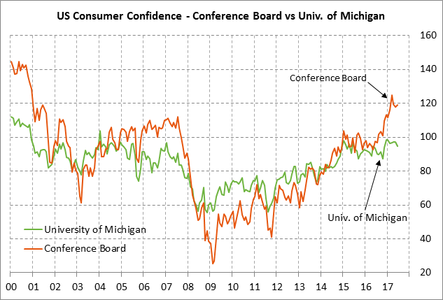 U.S. consumer sentiment expected to remain generally strong — The market consensus is for today’s final-Jun University of Michigan U.S. consumer sentiment index to be left unrevised from early June at 94.5, thus leaving the index down by -2.6 points from May. After the Nov 2016 election, the consumer sentiment index surged by +11.3 points to a 13-1/4 year high of 98.5 in January. However, the index has since fallen back and is 4.0 points below that high.