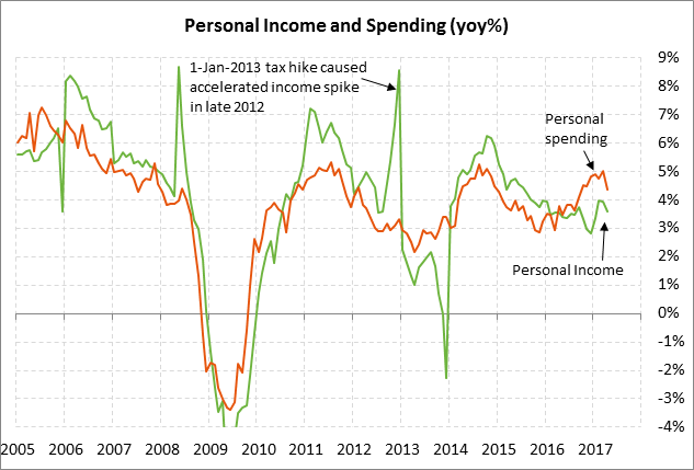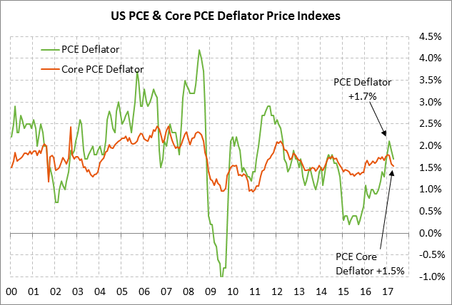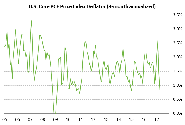 The PCE deflator has seen similar weakness. The PCE deflator in the last three months has shown a 3-month annualized gain of only +0.4% and the core CPI showed a +0.8% gain. On a year-on-year basis, the PCE deflator fell to +1.7% y/y in April from Feb’s 5-year high of +2.1%. The core PCE deflator fell to +1.5% in April from the 4-3/4 year high of +1.8% y/y posted in Jan-Feb.