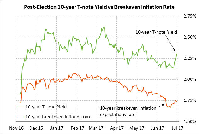 Rise in 10-year T-note yield is mainly due to surge in bund yields but also to higher inflation expectations and tighter Fed policy expectations — The 10-year T-note yield on Monday moved higher by another +5 bp to 2.35%, bringing the 1-1/2 week surge to a total of 21 bp since June 23. That jump in the 10-year T-note yield has mainly been due to the 22 bp surge in the 10-year German bund yield to a 3-1/2 month high of 0.48%. The surge in the bund yield in turn was caused by ECB President Draghi’s hawkish comments last Tuesday when he appeared to begin the process of preparing the markets for QE tapering in 2018 with an ECB announcement at either its Sep or Oct meetings. The surge in the bund yield was bearish for T-notes due to expectations for weaker European demand for Treasury securities because of improved Eurozone yields at home. In addition, the end of the ECB’s QE program in 2018 would mean reduced global liquidity in general.