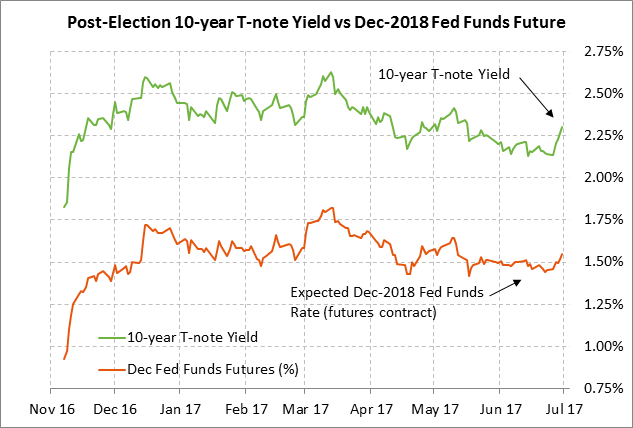 The recent surge in the 10-year T-note yield has also been due, however, to higher inflation expectations and tighter Fed expectations. The 10-year breakeven rate has risen by +5 bp in the past 1-1/2 weeks due to the +9% surge in oil prices. Meanwhile, the rise in Fed rate-hike expectations can be seen in the +13.5 bp rise in the Dec 2018 federal funds futures contract to a yield of 1.59% from 1.455% on June 23.