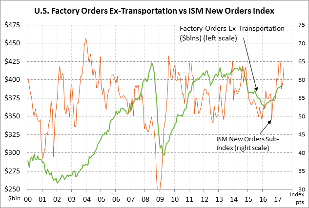 Despite expectations for a lackluster factory orders report today, there was positive news for the manufacturing sector in this past Monday’s ISM report. The June ISM manufacturing index unexpectedly rose by +2.9 points to a new 2-1/4 year high of 57.8. Moreover, the ISM manufacturing new orders sub-index rose by +4.0 points to the strong level of 63.5, indicating a strong orders pipeline.