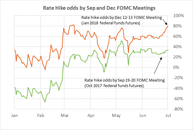 The Fed has so far lifted interest rates twice this year, leaving one more rate hike if the Fed wants to meet its Fed-dot forecast of three rate hikes per year during 2017 through 2019. The markets are attributing low odds for that rate hike at the next three FOMC meetings, i.e., 12% by the July 25-26 meeting, 28% by the Sep 19-20 meeting, and 30% by the Oct 31/Nov 1 meeting. However, the odds improve to 62% for the last meeting of the year on Dec 12-13.