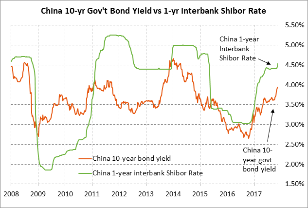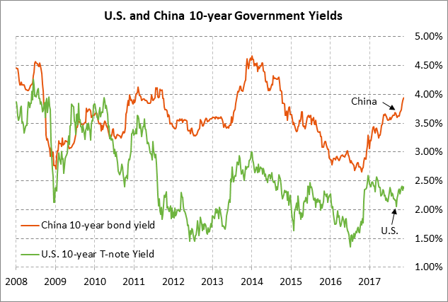 The Chinese 10-year bond yield has soared by +40 bp in the past several weeks due to fears that the government will more aggressively pursue its deleveraging campaign now that October’s Communist Party Congress is over. In addition, banking system liquidity has tightened up with the 1-year Shibor interbank rate rising by another +8.6 bp this week to a new 2-1/2 year high of 4.54%.
