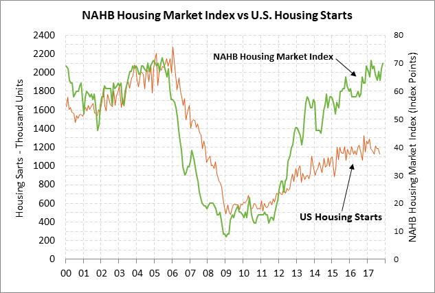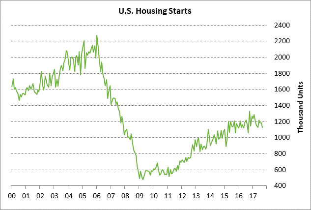 U.S. housing starts expected to rebound after hurricane disruptions — The market consensus is for today’s Oct housing starts report to show a +5.6% increase to 1.190 million, more than recovering Sep’s -4.7% decline to 1.127 million. Housing starts in October are expected to recover after hurricanes caused disruptions to home-building plans in September. U.S. home builder confidence quickly rebounded in Oct-Nov with an overall 6-point rise in the National Association of Home Builders Housing Index to 70, which was only 1 point below the 12-year high of 71 posted in March. That rebound in confidence is likely to translate to increased home building activity.