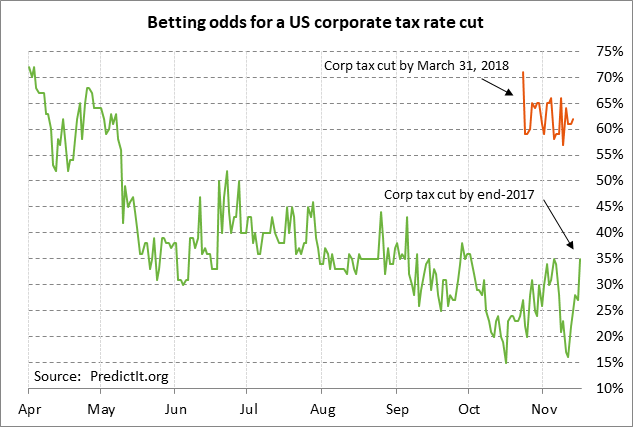 The betting odds for the approval of a tax bill by end-end jump sharply by +8 points to 35% on Thursday after the House easily passed its bill, according to PredictIt.org. The odds are much better at 64% for passage by March 31, 2018. We continue to expect Congress to approve a tax bill by early 2018 since it has become an almost existential issue for the Republicans to pass a tax cut of some kind.
