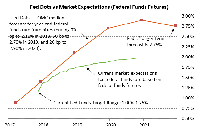 The markets continue to doubt that the Fed will follow through with the Fed-dot forecast for three +25 bp rate hikes in 2018 to add to December’s expected rate hike.  The markets are only discounting 1-1/2 rate hikes in 2018, which is half of the Fed-dot forecast for three rate hikes.