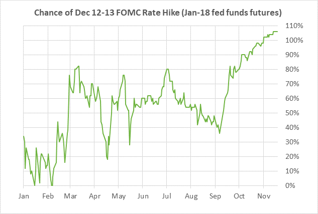 That means that President Trump currently must replace a majority of the Fed seats with own picks, giving him wide latitude to affect the dovish/hawkish bent of the Fed going into 2018.  Mr. Trump has already appointed Jerome Powell as the new Fed Chair, which was viewed by the markets as a dovish choice relative to the other main contenders of John Taylor or Kevin Warsh.
