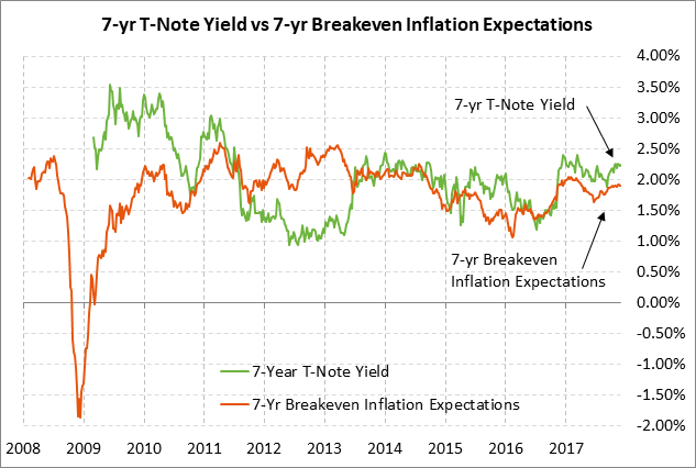 7-year T-note auction to yield near 2.22% — The Treasury today will sell $28 billion of 7-year T-notes, concluding this week’s $88 billion T-note package. Today’s 7-year T-note issue was trading at 2.23% in when-issued trading late Monday afternoon. That translates to an inflation-adjusted yield of 0.34% against the current 7-year breakeven rate of 1.89%.