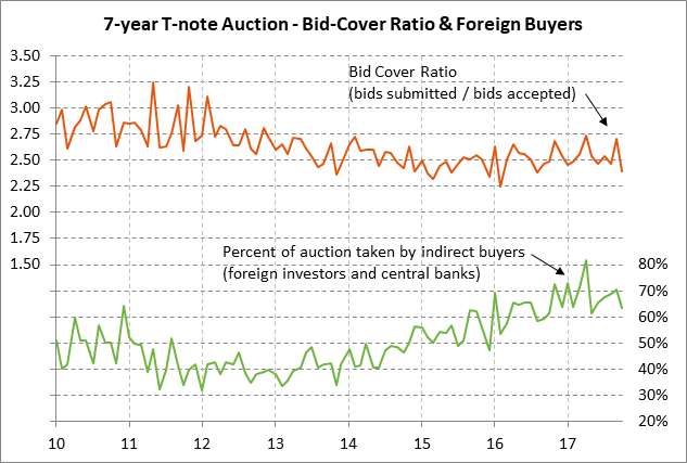 The 12-auction averages for the 7-year are as follows: 2.55 bid cover ratio, $12 million in non-competitive bids, 4.5 bp tail to the median yield, 20.3 bp tail to the low yield, and 42% taken at the high yield. The 7-year is the second most popular coupon security among foreign investors and central banks, behind the 30-year TIPS. Indirect bidders, a proxy for foreign buying, have taken an average of 68.6% of the last twelve 7-year T-note auctions, well above the average of 61.8% for all recent Treasury coupon auctions.