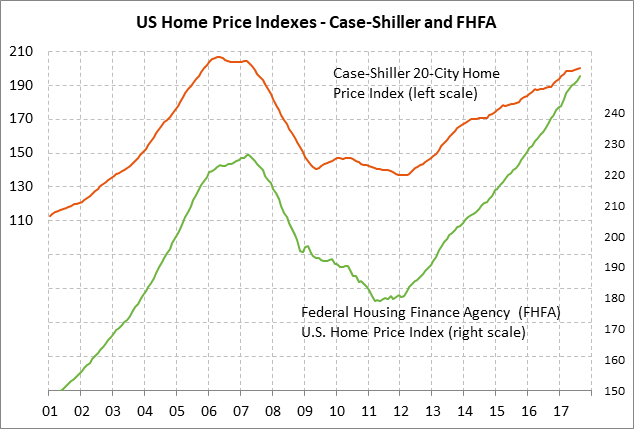 The broader FHFA index has risen sharply by +6.6% on a year-on-year basis and by a total of +41% from its housing-bust trough. Meanwhile, the Composite-20 index of metropolitan homes has risen sharply by +6.0% y/y and by +46% from its housing-bust low.