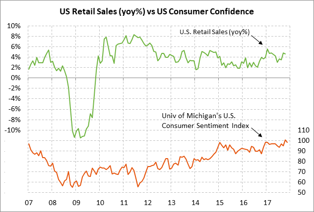 U.S. consumer confidence remains very strong due to (1) record highs in the stock market, (2) improving household wealth with the rising stock market and real estate market, (3) the strong labor market, which gives consumers more confidence about job security, and (4) rising income levels. Negative factors for consumer sentiment include (1) Washington political uncertainty, (2) geopolitical worries such as North Korea, and (3) the 50 cent/gallon rise in gasoline prices in the past 5 months.