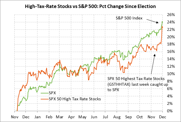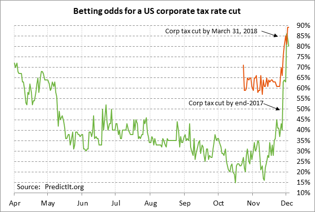 While there will undoubtedly be ups and downs over the next 2-3 weeks while Republicans work on a common tax bill, we continue to expect Republicans to find a bill that they can push through both houses of Congress since passing a tax reform bill has virtually become an existential issue for Republicans. The betting odds now heavily favor a deal getting done. The betting odds on Sunday evening were at 80% for a corporate tax cut by year-end and at 89% for a tax cut by March 31, 2018, according to PredictIt.org.