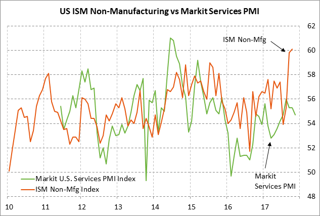 U.S. ISM non-manufacturing index expected to remain strong — The market consensus is for today’s Nov ISM non-manufacturing index to show a -1.1 point decline to 59.0.  However, that decline would still leave the index in strong territory, just mildly below October’s 12-year high of 60.1.  Business confidence remains strong due to (1) the 3% GDP growth seen in the past two quarters, (2) stronger overseas economic growth, and (3) expectations for tax cuts.