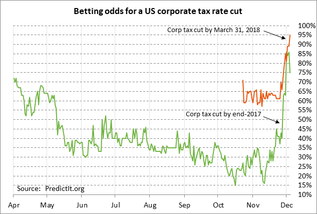 Betting odds rise to 95% for tax bill by Q1— The betting odds on Monday for Congress to approve a tax bill by March 31, 2018 rose by 6 points to a record 95%, according to PredictIt.com.  Meanwhile, the betting odds for a tax deal by year-end remained high at 75%.