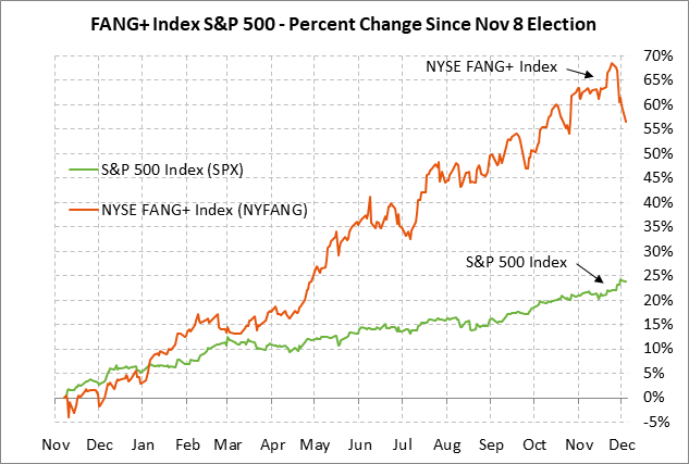 Tech stocks have been hurt in the past week by (1) heavy year-end long liquidation pressure after this year’s run-up, (2) rotation out of tech stocks, which will receive a smaller tax benefit from tax reform relative to the higher-taxed industrial and financial sectors, and (3) the surprise news that the Senate last Friday night added a 20% corporate alternative minimum tax (AMT) to its tax bill, which would mean that corporations would not be able to obtain any benefit from popular tax deductions such as the R&D credit or write-offs for equipment spending and intellectual property.