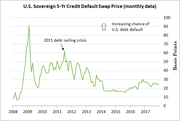 The threat of a government shutdown is not having any impact on the market’s perception of the U.S. credit quality since a shutdown would not risk a Treasury default.  The current debt ceiling extension will expire this Friday, as well as the CR, but a new debt ceiling hike will not be necessary until spring 2018 since the Treasury can once again use emergency procedures to stay under the debt limit.  The U.S. 5-year credit default swap (the price of insurance against a U.S. sovereign debt default) has moved sideways in a narrow range in recent months and was subdued at only 23.77 bp on Monday.