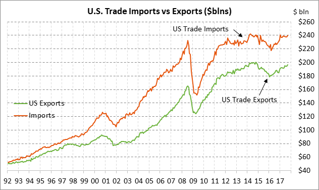 U.S. trade deficit expected to widen — The market consensus is for today’s Oct trade deficit report to widen moderately to -$47.4 billion from Sep’s -$43.5 billion.  The expected report would push the deficit up to a 9-month high and leave it moderately wider than the 12-month trend average of -$44.9 billion.  The deficit has been pushed higher in recent months by the increase in oil prices, which boosted the value of imported oil.  Indeed, imports in September were up by +6.1% y/y, stronger than export growth of +4.6% y/y.  A wider U.S. trade deficit would not be well-received at the White House and may increase the odds for protectionist trade measures.