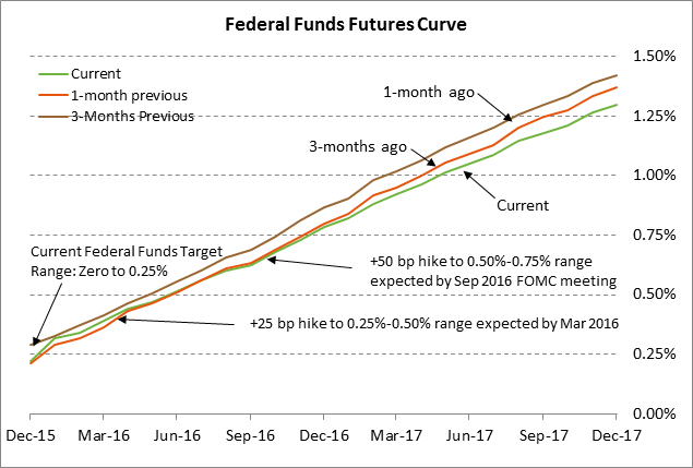 FOMC today will likely go ahead with a rate hike despite government shutdown and junk bond uncertainties — We expect the FOMC today to go ahead with a +25 bp rate hike despite the uncertainties caused by the current turmoil in the junk bond market and by the chance for a U.S. government shutdown if Congress cannot agree on an omnibus budget bill. The federal funds futures market is discounting a 76% chance of a Fed +25 bp rate hike today, little changed from recent levels. A 25 bp rate hike would push the new funds rate target up to 0.25-0.50% (from the current zero-0.25%) with a new mid-point of 0.375%.