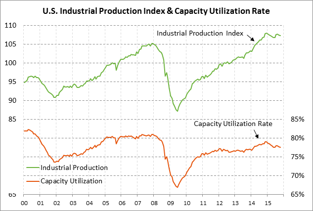 Industrial production expected to show another decline — The market is expecting today’s Nov industrial production report to show a decline of -0.1% m/m, adding to Oct’s -0.2% decline. Meanwhile, the market is expecting today’s Nov manufacturing production report to be unchanged m/m after Oct’s +0.4% increase. The U.S. manufacturing sector continues to see downward pressure from the petroleum sector recession and from weak exports.