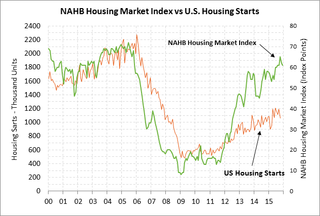 Housing starts expected to recover somewhat after Oct’s sharp decline — The market is expecting today’s Nov housing starts report to show an increase of +6.6% to 1.130 million, recovering part of October’s sharp -11.0% decline to 1.060 million. Housing starts posted an 8-year high of 1.21 million units in June 2015 but have since seen some weakness due to the August stock market correction and cautiousness among U.S. home builders.