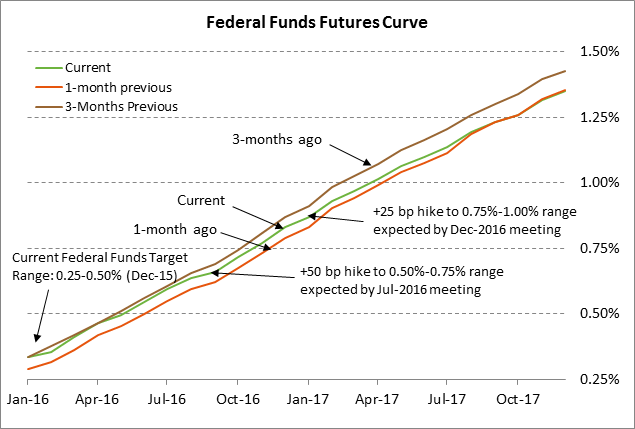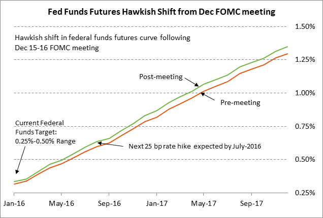 Fed’s first rate hike is easily digested by the markets on confidence that the rate-hike regime will be gradual — The FOMC yesterday mercifully implemented its long-awaited 25 bp rate hike to a new funds rate target of 0.25-0.50%. The outcome of the meeting was roughly in line with market expectations as the FOMC in its post-meeting statement promised a “gradual” rate hike dependent on data. However, the farther end of the federal funds curve on a yield basis moved higher by 5 bp, discounting a mildly higher chance for Fed rate hikes in 2016 and beyond.