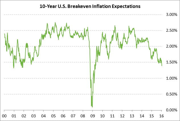 Meanwhile, market expectations for inflation continue to fall due to the sharp drop in oil prices seen so far this year and generally weak global economic growth.  The 10-year breakeven inflation expectations rate, which measures the difference between nominal and TIPS yields, closed at 1.40% yesterday, just 1 bp above last Friday’s 3-1/2 month low of 1.39% and just 2 bp above last September’s 6-2/3 year low of 1.38%.