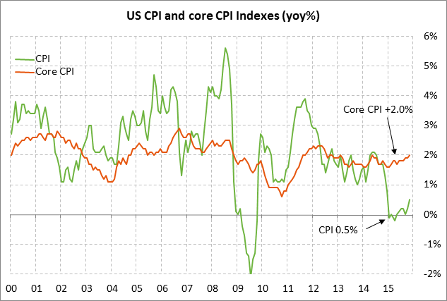 Today’s expected rise in the Dec core CPI to +2.1% y/y is of little consequence since the Fed’s preferred inflation measure is the PCE deflator, which continues to trade on a very weak basis compared with the CPI.  In November, the PCE deflator was at only +0.4% y/y and the core PCE deflator was at only +1.3% y/y, thus matching the 4-1/2 year low seen all during 2015.  The core PCE deflator figure of +1.3% is far below the Fed’s inflation target of +2.0%.  Moreover, the core inflation figures are unlikely to move higher over the near-term given the continued downward pressure on prices from falling oil and commodity prices and weak global demand.