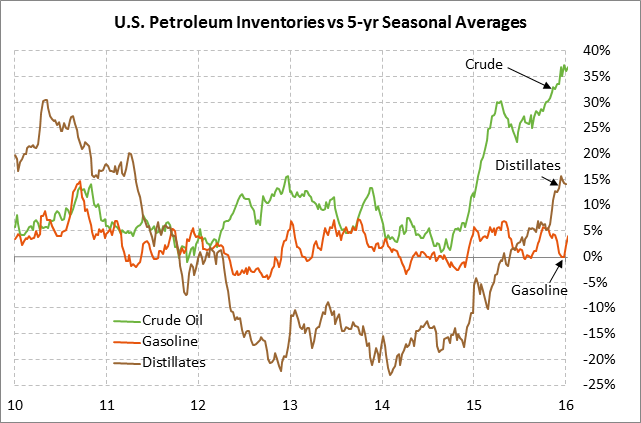 U.S. crude oil inventories remain in an epic glut at +36.9% (130 million bbls) above the 5-year seasonal average.  Crude oil inventories at the Cushing hub, where Nymex WTI futures are priced, have risen for 10 consecutive weeks and in last week’s report rose by +0.2% to a new record high of 64.007 million bbls.  Meanwhile, product inventories are ample with gasoline inventories +4.0% above the 5-year seasonal average and distillate inventories +14.1% above average.