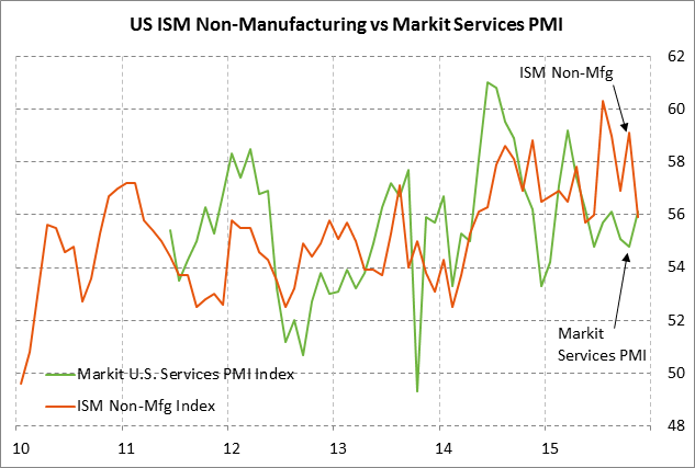 Markit U.S. services PMI expected to edge lower but remain in relatively strong shape — The market is expecting today’s preliminary Markit U.S. services PMI to show a small -0.2 point decline to 55.9, giving back a small part of November’s solid +1.3 point advance to 56.1. The services PMI in Nov matched the 6-month high of 56.1 posted in August, but remained well below the peak of 61.0 posted in June 2014. The current 56.1 level of the services PMI is much better than the Markit U.S. manufacturing PMI of 52.8, indicating how U.S. service sectors are doing relatively well compared to the recessionary U.S. manufacturing sector. The market consensus is for relatively steady U.S. GDP near +2.4% over at least the next few quarters.