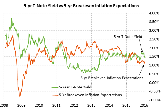 With the plunge in oil prices to new lows in January, the Fed’s “reasonable confidence” that inflation will rise to 2% over the medium-term looks increasingly out of touch.  Indeed, the 10-year breakeven inflation expectations rate, which measures the difference between nominal and TIPS 10-year T-notes, fell to a 6-3/4 year low of 1.29% last Friday but rebounded higher to 1.35% by yesterday.