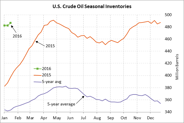 EIA report expected to show a large 4.0 million bbl rise in U.S. crude oil inventories — The market consensus for today’s weekly EIA report is for a large +4.0 million bbl rise in U.S. crude oil inventories, a +500,000 bbl rise in gasoline inventories, a -2.0 million bbl decline in distillate inventories, and a -1.0 point decline in the refinery utilization rate to 89.6%.  U.S. oil inventories remain in a major glut at 36.1% (129.0 million bbls) above the 5-year seasonal average.  Meanwhile, gasoline inventories are ample at +5.2% above average and distillates are approaching glut territory at +16.8% above average.  U.S. crude oil production has so far fallen by only -3.9% to 9.235 million bpd from the 43-year high of 9.610 million bpd posted in June 2015 despite the fact that the number of active U.S. oil rigs has plunged by 68% (1,099 rigs) to a 5-3/4 year low of 510 rigs.