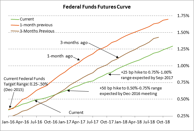 In fact, for all of this year, the federal funds futures market is now discounting only one 25 bp rate hike by December.  That is more dovish than expectations in Dec 2015 (i.e,. before the January turmoil) for two 25 bp rate hikes in 2016.  The market is far more dovish than the last set of “Fed dots” in December, which forecast an improbable four rate hikes in 2016.